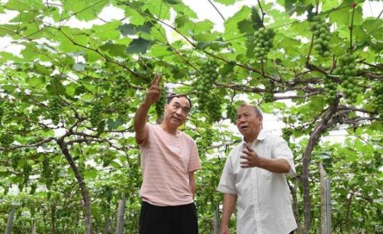 科技特派员谢福鑫(右)在福建省南平市建阳区考亭村一处葡萄园里指导果农(5月27日摄)。新华社记者 林善传 摄