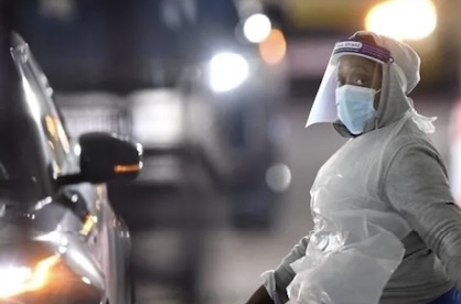 资料图:图为伦敦的一个免下车检测中心,一名医务工作者正准备对司机进行核酸检测。