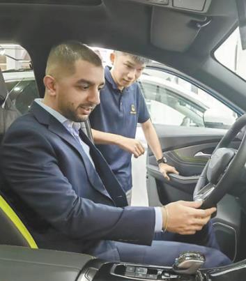 在阿联酋迪拜壹路集团汽车销售展厅,当地顾客体验东风风行品牌新能源汽车。本报记者 任皓宇摄