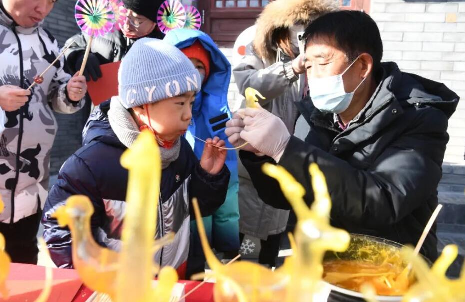 1月25日,北京石景山区模式口文化街,孩子正在艺人的指导下吹糖人。