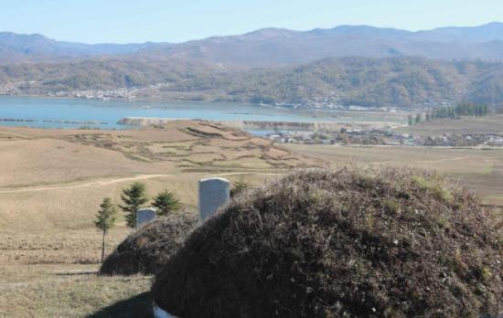 这是10月23日在朝鲜咸镜南道西北部拍摄的长津邑中国人民志愿军烈士合葬墓地。山坡下的湖即为朝鲜北部最大的湖泊长津湖。新华社记者 江亚平 摄